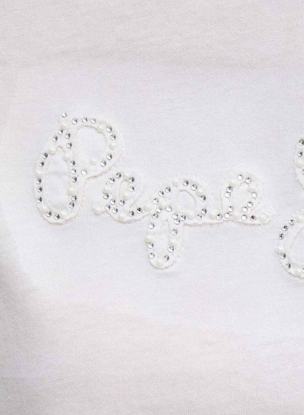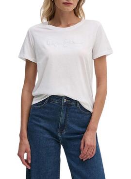 Camiseta Pepe Jeans. Modelo Espe. Cor branca. Gola redonda. Manga curta. Logotipo bordado com strass no peito. Ajuste regular.