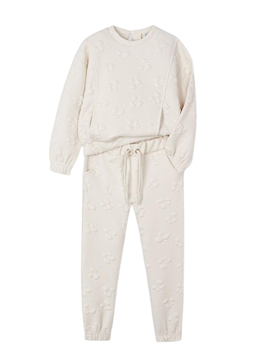 Conjunto de treino Mayoral. Cor cru. Camisola com gola redonda. Punhos e bainha elásticos. Calças jogger. Com cordões. Estampado de flores.