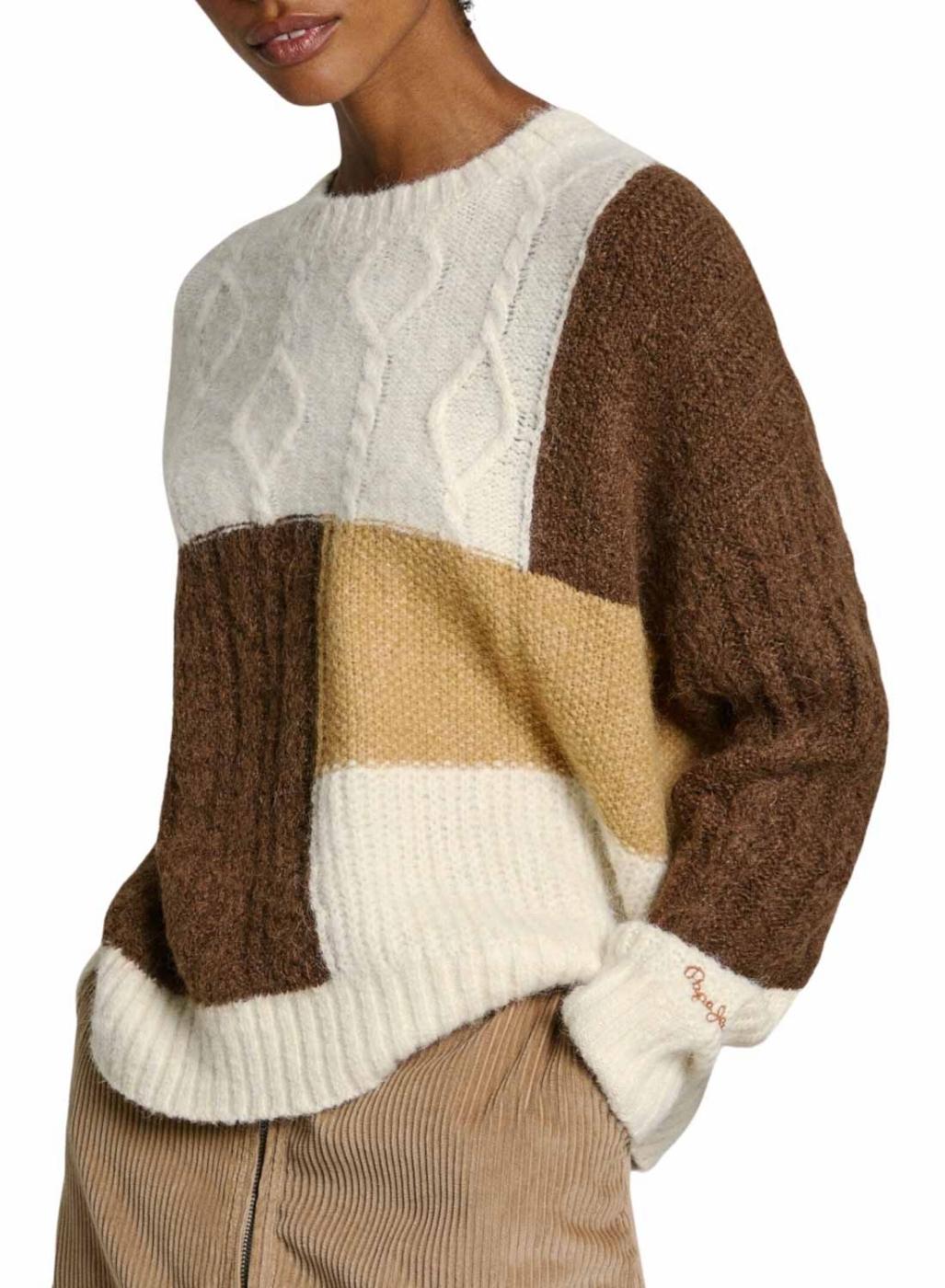 Camisola Pepe Jeans. Modelo Hilary. Malha de lã e alpaca. Gola redonda. Cores bege, marrom e creme. Estilo bloco de cores. Manga comprida. Extremidades caneladas. Malha trançada.