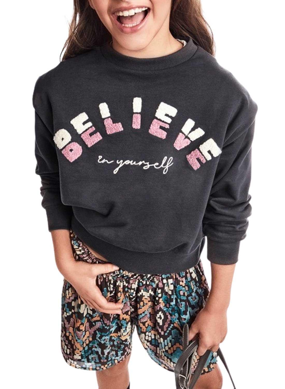 Moletom Mayoral. Cor cinza carvão. Manga comprida. Barra e punhos elásticos. Gola redonda. Texto "believe in yourself".