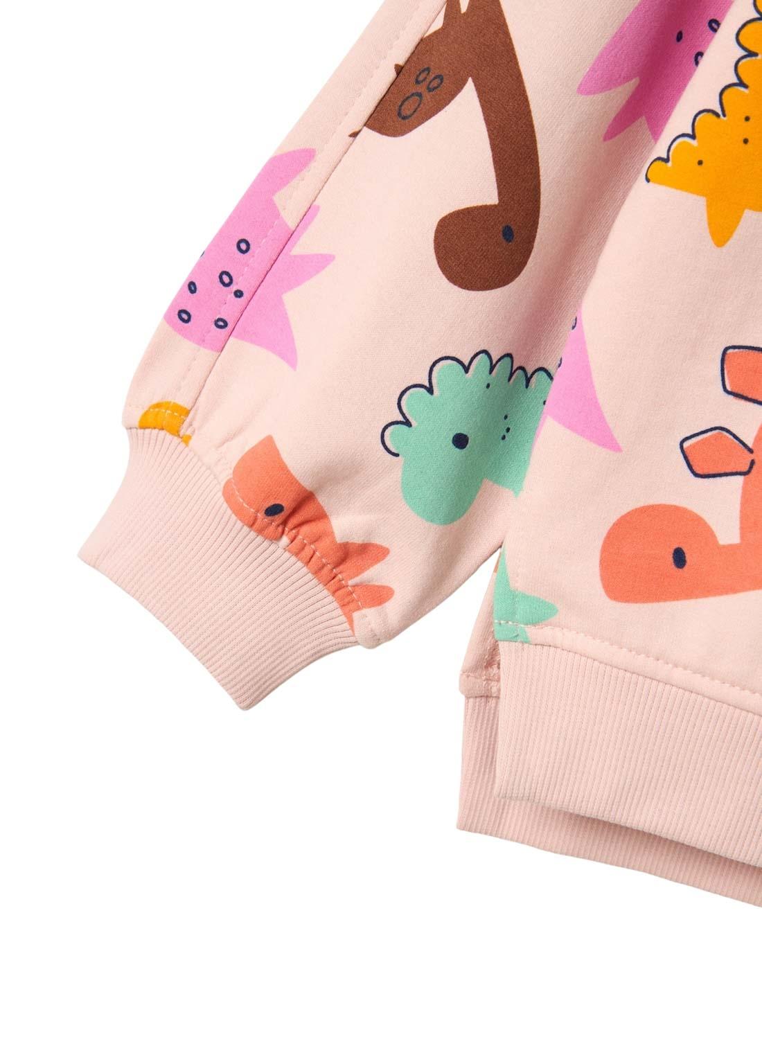 Moletom Name It. Cor rosa. Estampado com dinossauros multicoloridos. Corte folgado. Manga comprida. Gola redonda. Acabamentos canelados. Barra com aberturas laterais.