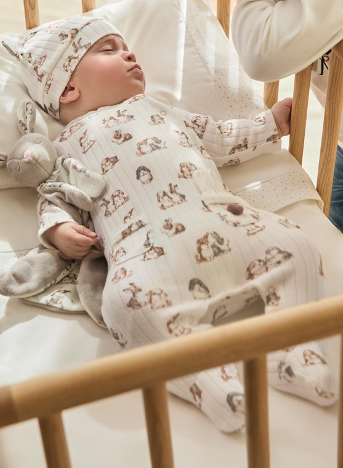 Macacão de Mayoral. Cor cru. Conjunto com touca. Bolsos laterais. Estampado de coelhinhos. Canelado. Gola redonda. Botões de fecho. Abertura lateral. Touca com orelhas.