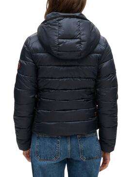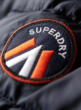 Casaco Superdry. Modelo Fuji. Cor azul marinho. Zíper de fechamento. Remendo da marca bordado na manga. Bolsos laterais. Gola alta com capuz. Ajuste regular. Comprimento acima dos quadris.