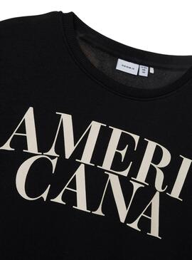Moletom Name It. Modelo Oriana. Cor preta. Design gráfico no peito. Texto Americana. Gola redonda. Manga comprida. Cintura e punhos elásticos. Folgada.