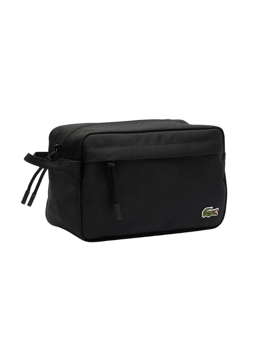 Nécessaire Lacoste. Modelo Toilet Kit. Cor preta. Tecido de lona. Fecho com zíper. Bolso exterior com zíper. Emblema da marca bordado. Alça lateral para segurar. Dimensões: 24 x 15 x 11 cm.