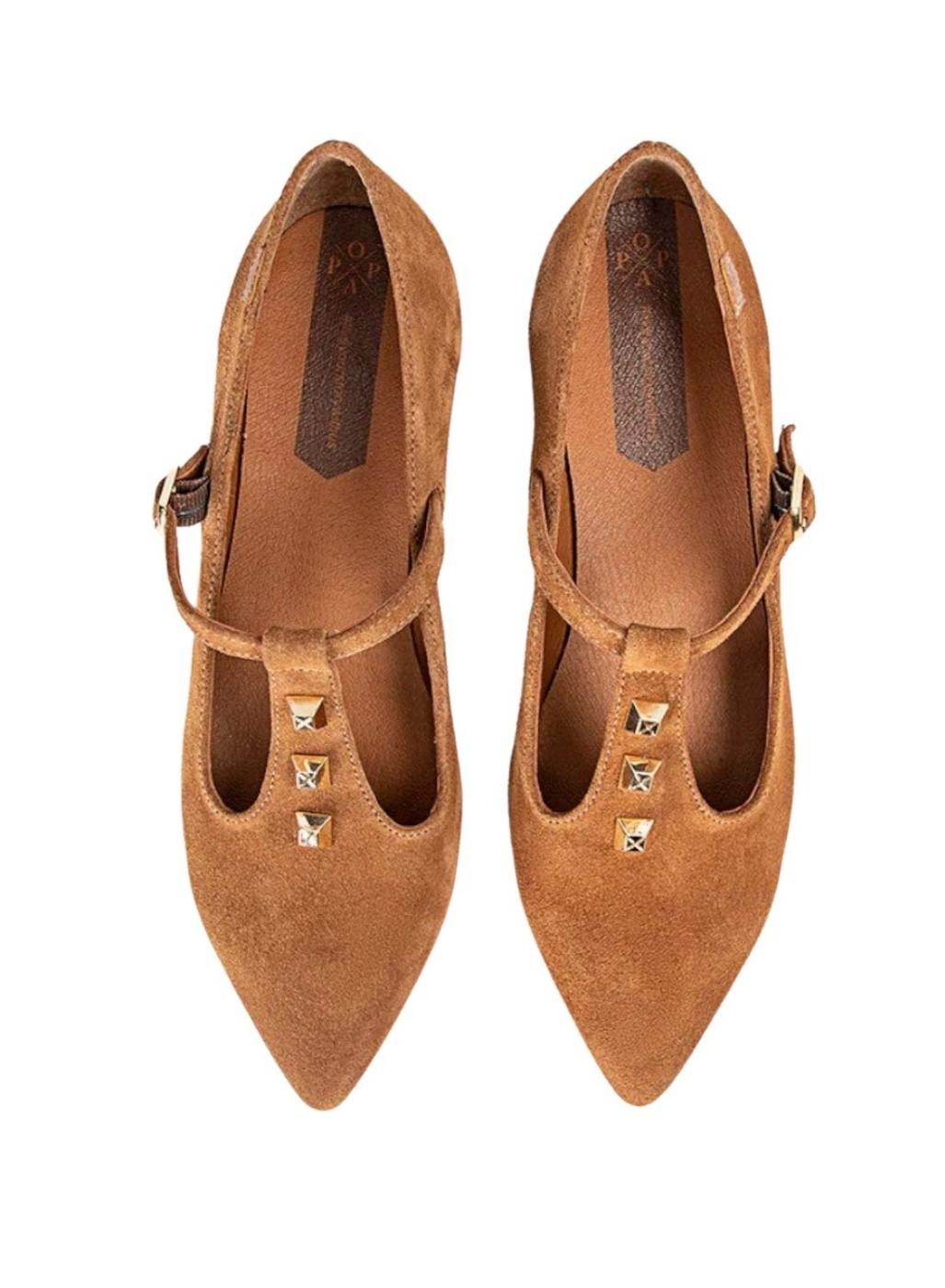 Bailarina Popa. Modelo Ipic. Tecido de camurça. Tira central com tachas douradas. Com pulseira na parte do peito do pé. Fecho com fivela dourada. Parte da frente em ponta.