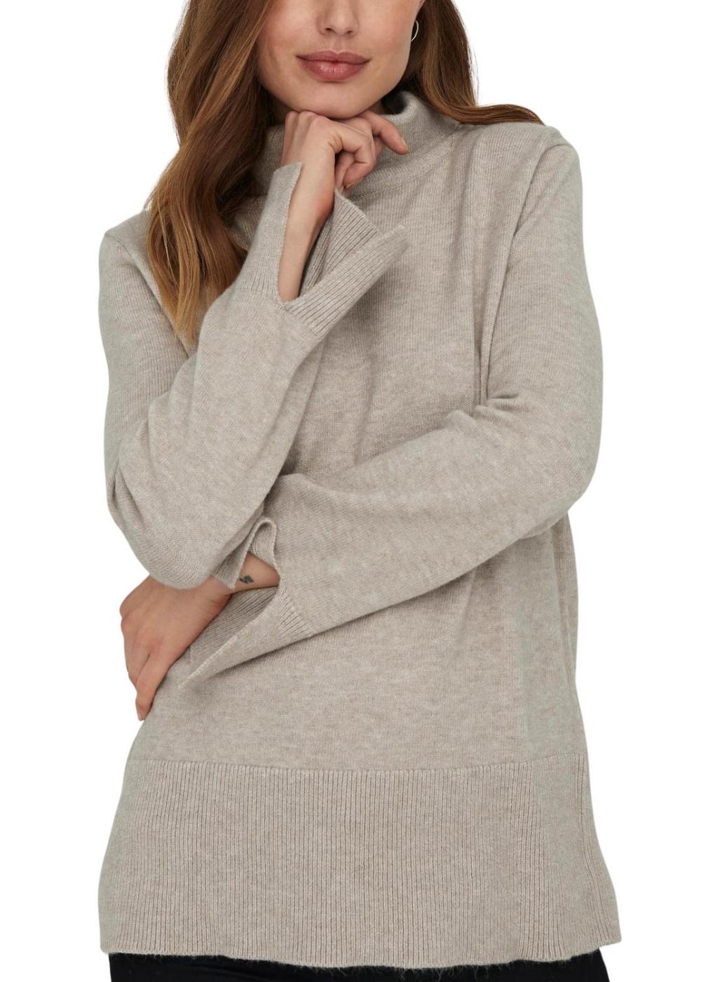 Camisola Only. Modelo Fia. Cor bege. Gola alta. Extremidades caneladas. Ajuste regular. Estilo básico. Extremidades das mangas com abertura.