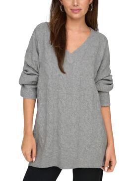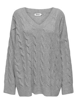 Camisola Only. Malha trançada. Decote em V. Cor cinza. Manga comprida. Ombros caídos. Formato comprido. Acabamentos canelados. Corte folgado. O modelo veste o tamanho S.
