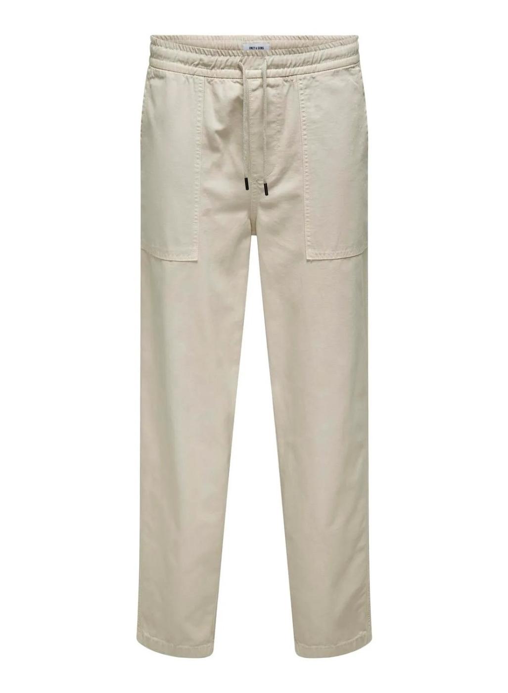 Calça Only and Sons. Tecido de algodão. Cor bege. Cintura ajustável com cordões elásticos. Bolsos dianteiros alongados. Corte folgado. Bolsos traseiros quadrados. Etiqueta da marca costurada em um bolso traseiro.