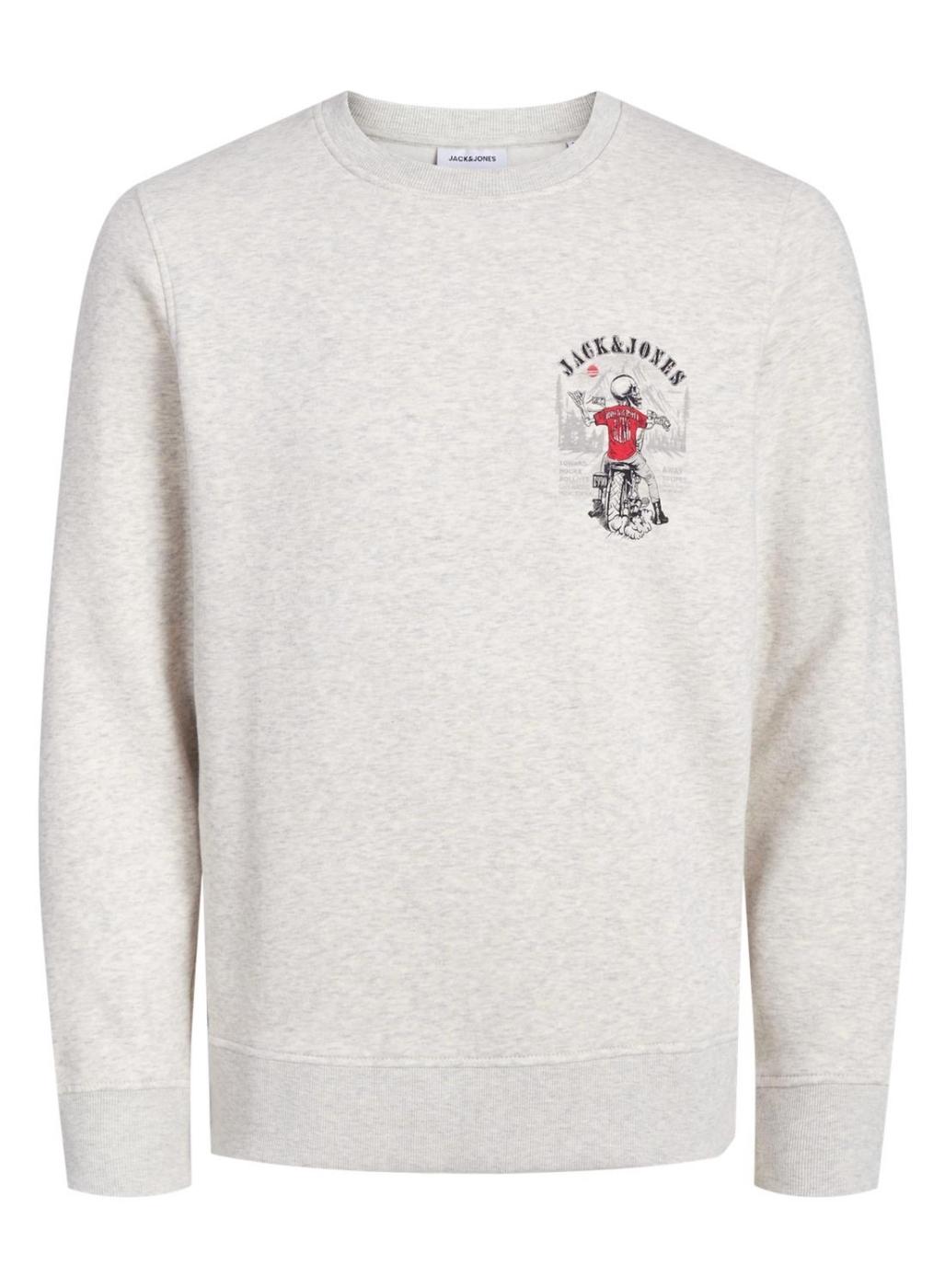 Moletom Jack and Jones. Modelo Skull. Cor bege. Gola redonda. Manga comprida. Acabamentos canelados. Estampa no peito. Ajuste padrão. Interior felpudo.