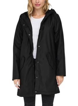 Capa de chuva Only. Cor preta. Capuz forrado com pele de carneiro. Tecido impermeável. Fechamento com zíper e botões. Bolsos na parte da frente com abas e botões. Caimento regular. Interior com pele de carneiro. A modelo veste o tamanho S.