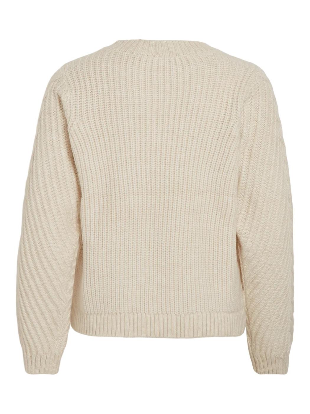 Camisola Vila. Cor beige. Gola redonda. Manga comprida. Tecido de malha texturizada com tranças. Corte regular. A modelo veste o tamanho S.