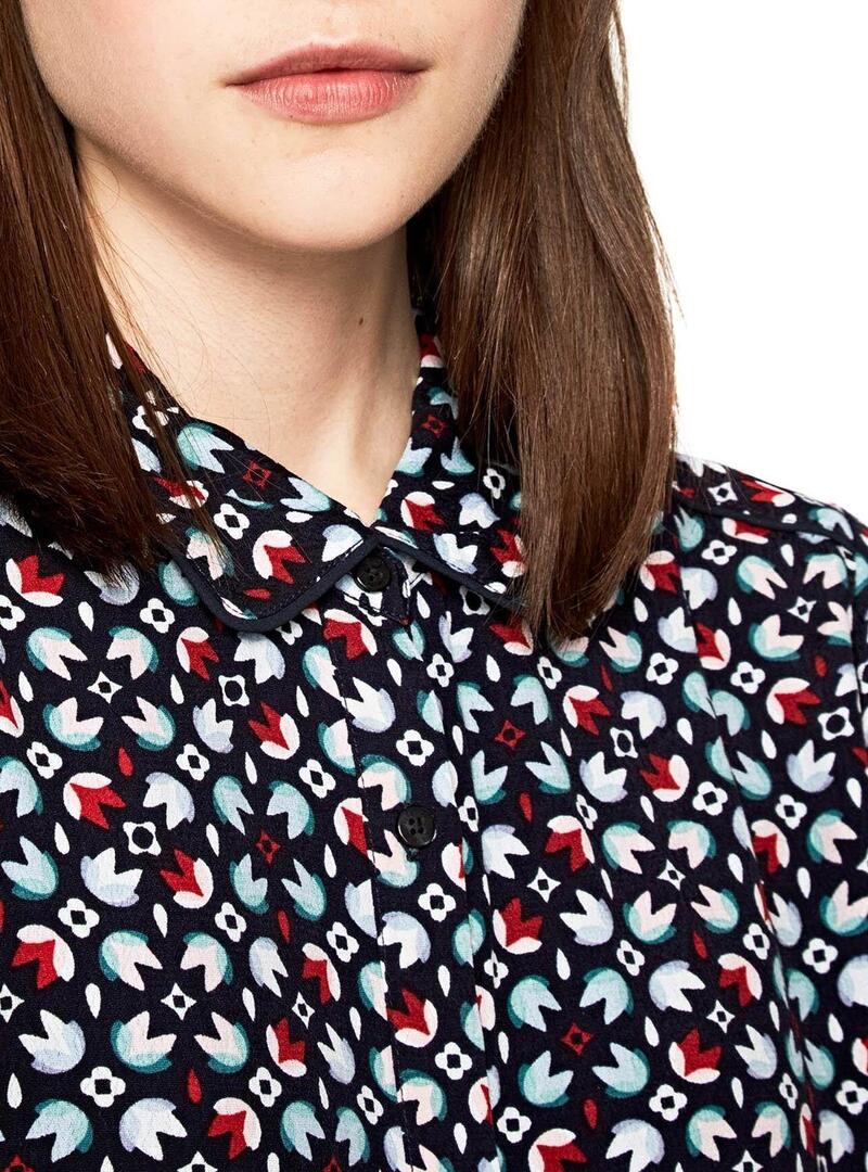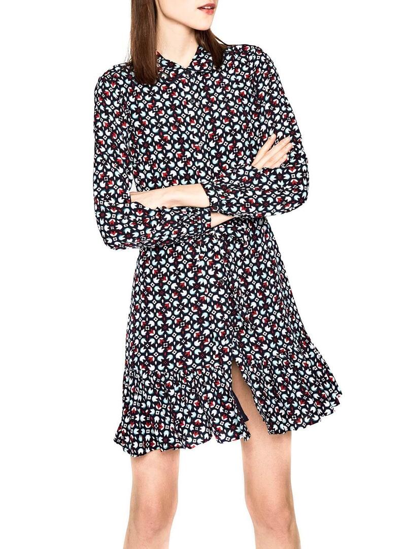 Pepe Jeans vestido. Modelo Valerian . Manga comprida. Tecido fluido. Estampado multicolor. Volante con baixo. Corte na cintura. Fecho denatero con botão é. O modelo usa tamanho S.