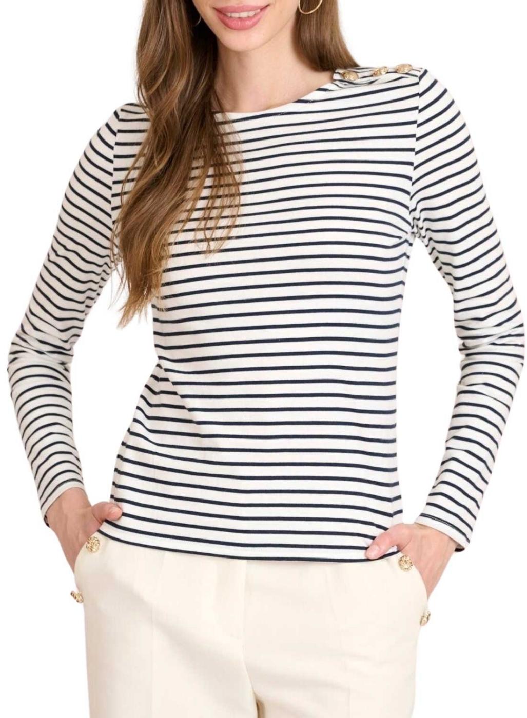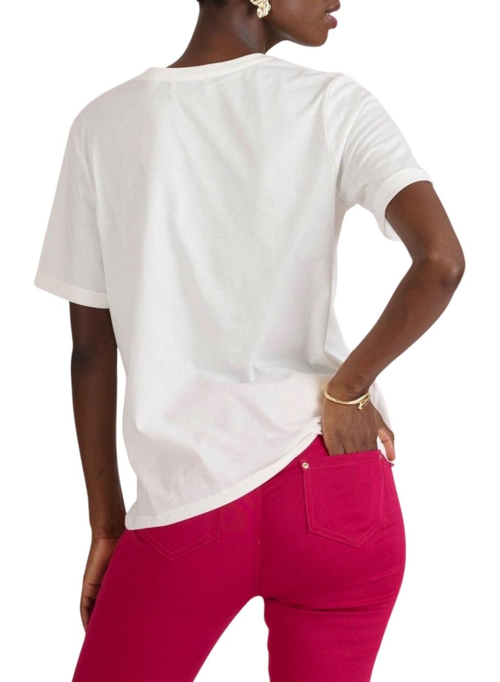 Camisa Naf Naf. Impressão de listras. Decote em V. Coração bordado no peito. Manga 3/4. Formato regular.