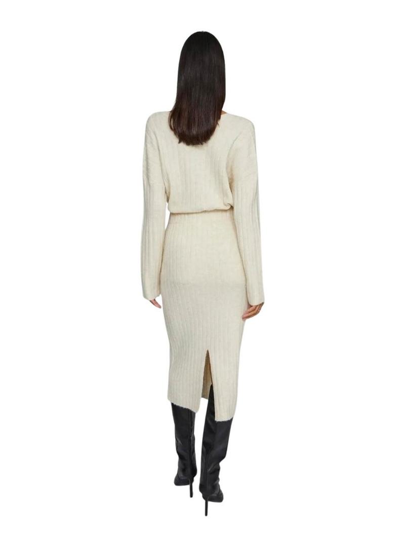 Camisola Vila. Modelo Vimiraz. Cor bege. Decote em V. Tecido canelado. Caimento folgado. Manga comprida. Ombros caídos.