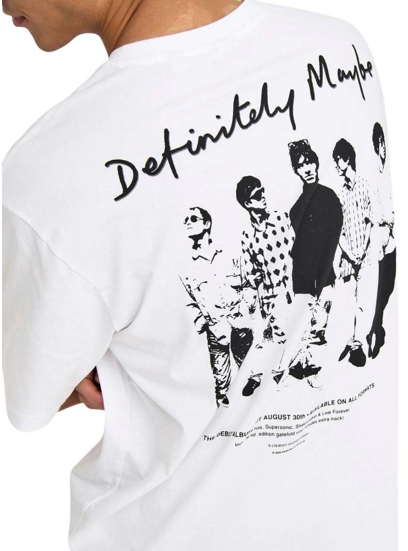 Camiseta da Only and Sons. Cor branca. Modelo Oasis Definitely Maybe. Manga curta. Gola redonda. Feita de algodão. Estampa da banda Oasis com estampa no peito e nas costas. Corte folgado. Edição limitada.