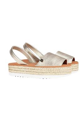 Menorquina Popa. Modelo Saona. Estilo laminado. Cor dourada. Plataforma de 3cm. Sola de EVA. Entressola de Juta. Logotipo lateral. Fita de agarre no calcanhar.
