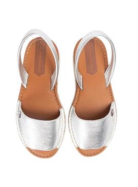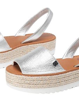 Menorquina Popa. Modelo Saona. Estilo laminado. Cor prateado. Plataforma de 3cm. Sola de EVA. Entresola de juta. Logo lateral. Fita de apoio no calcanhar. Palmilha acolchoada de pele vegana.