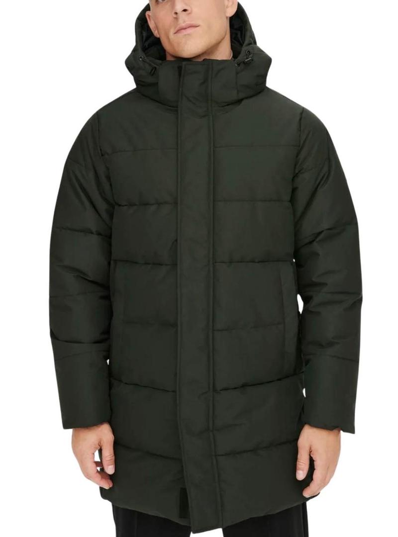 Jaqueta acolchoada Only and Sons. Cor verde. Com capuz removível. Fecho com zíper. Forro de poliéster. Bolsos laterais. Punhos canelados. Comprimento longo.