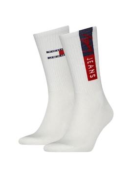 Pack 2 pares de meias Tommy Jeans brancas com logotipo vertical para homem e mulher.