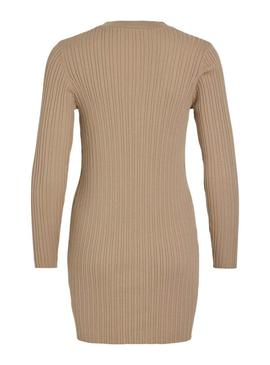 Casaco Vila. Modelo Vimullie. Cor bege. Fechamento com botões. Corte longo. Decote em V. Tecido canelado e elástico.
