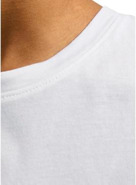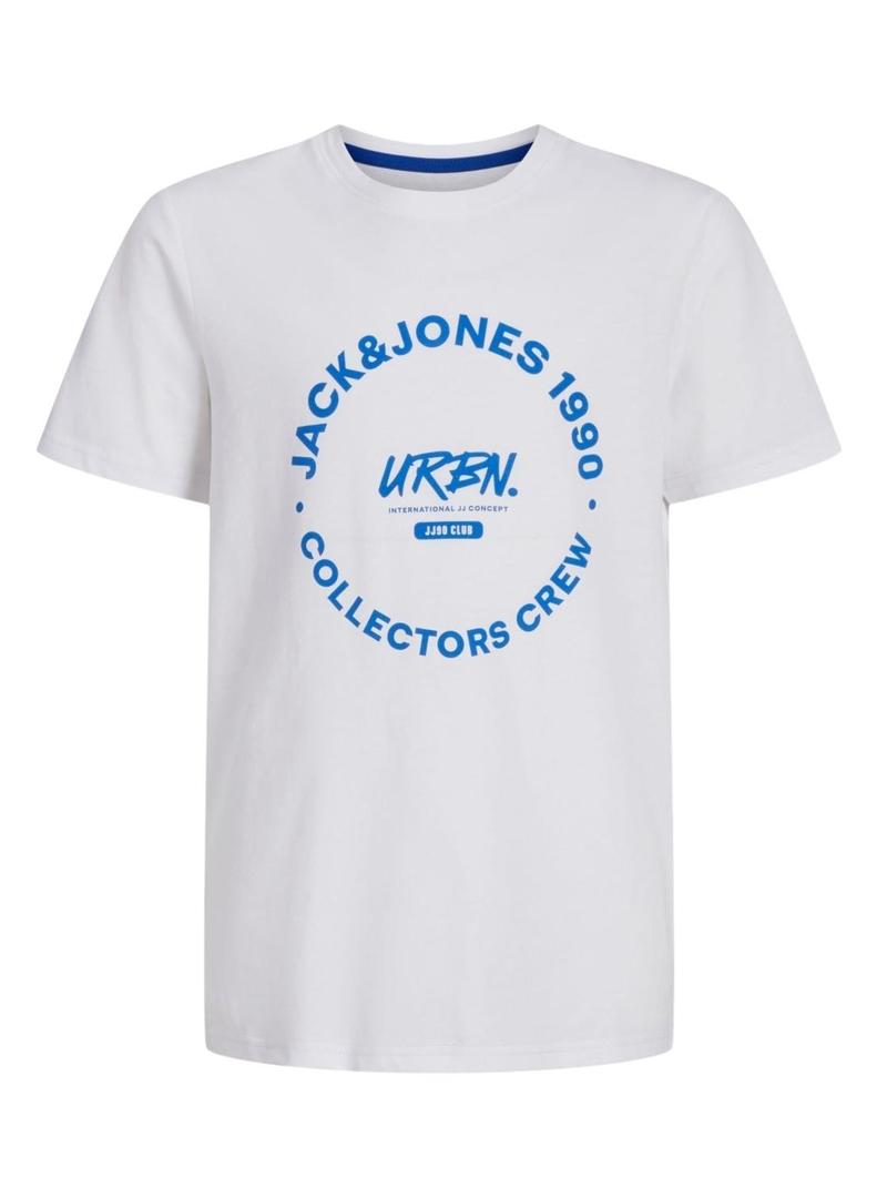 Camiseta Jack and Jones. Cor branca. Gola redonda canelada. Manga curta. Logotipo circular em azul no peito. Formato regular.