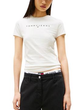 Camiseta Tommy Jeans. Modelo Slim Linear. Cor branca. Manga curta. Gola redonda. Estampa da marca no peito. Ajuste slim.