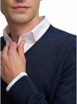 Camisola Silbon. Modelo Vneck. Cor azul marinho. Gola em V. Estilo básico. Extremidades caneladas. Ajuste regular. Logotipo bordado no peito.