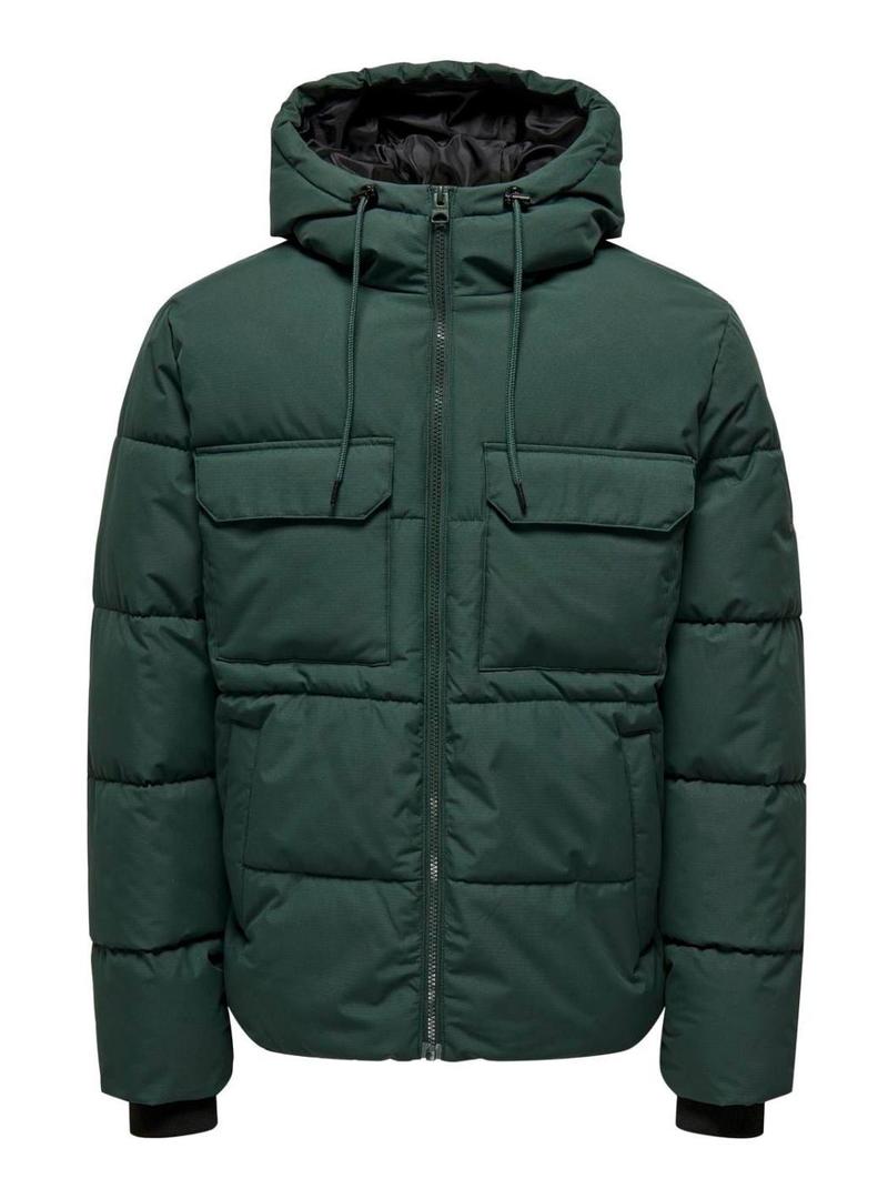 Jaqueta Only and Sons. Modelo Selijah. Capuz ajustável com cordão. Fecho de correr. 4 bolsos. Acolchoado. Resistente ao vento.