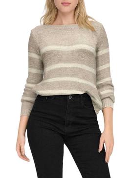 Camisola Only. Modelo Geena. Cor cinza. Manga comprida. Gola redonda. Design às riscas. Corte regular.