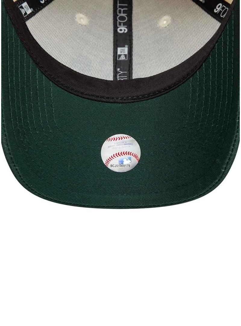 Boné New Era. Modelo Colour Block. Cor bege. Logo bordado em linha verde. Viseira verde. Emblema da liga bordado na lateral. Fita traseira ajustável.