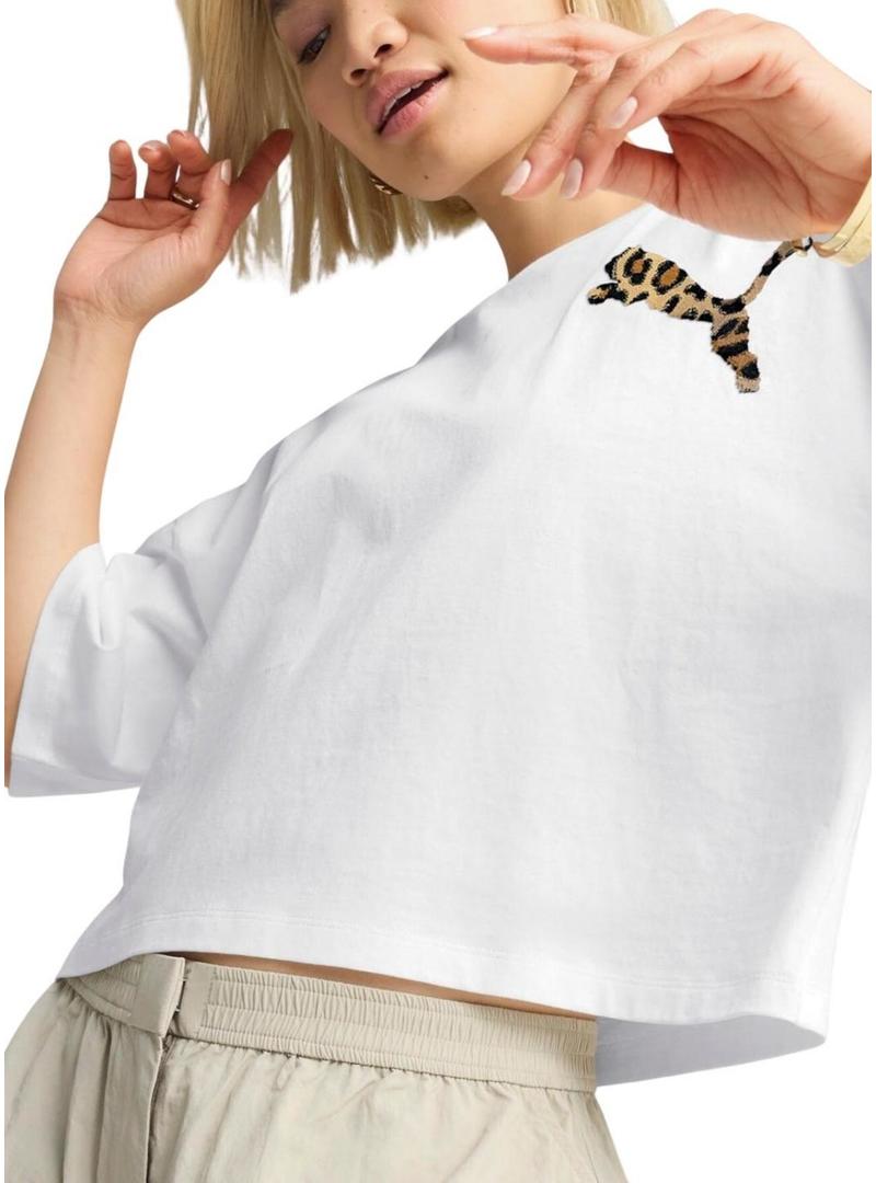 Camiseta Puma. Modelo Leo Luxe. Cor branca. Logotipo da marca no peito. Corte oversize.