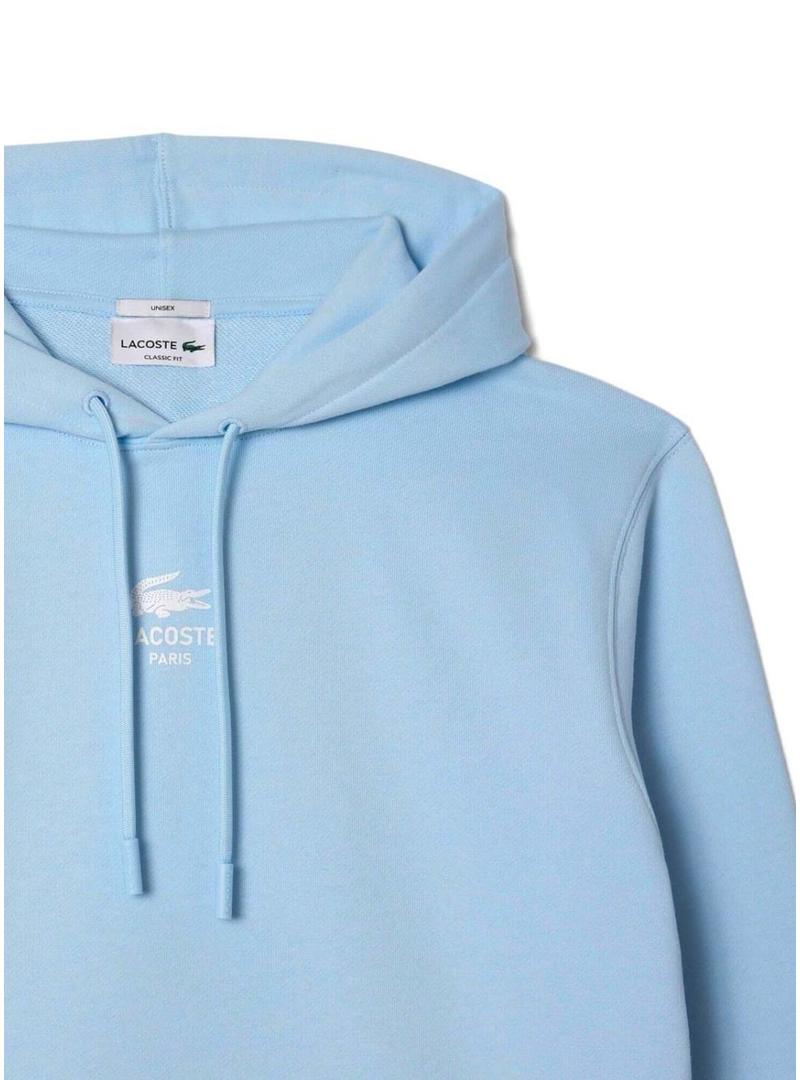 Moletom Lacoste com capuz estampado azul para homem e mulher.