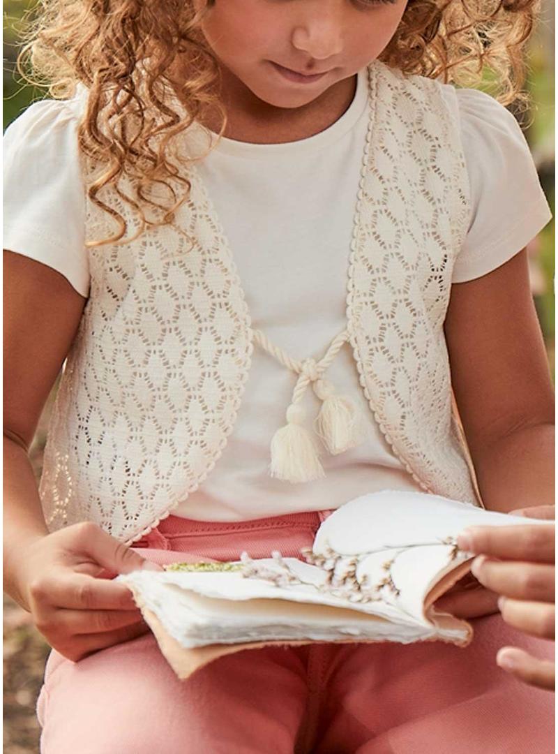 Camiseta Mayoral. Com colete removível. Cor bege. Manga curta. Gola redonda. Fechamento do colete com cordões. Detalhe de franjas. Tecido vazado.