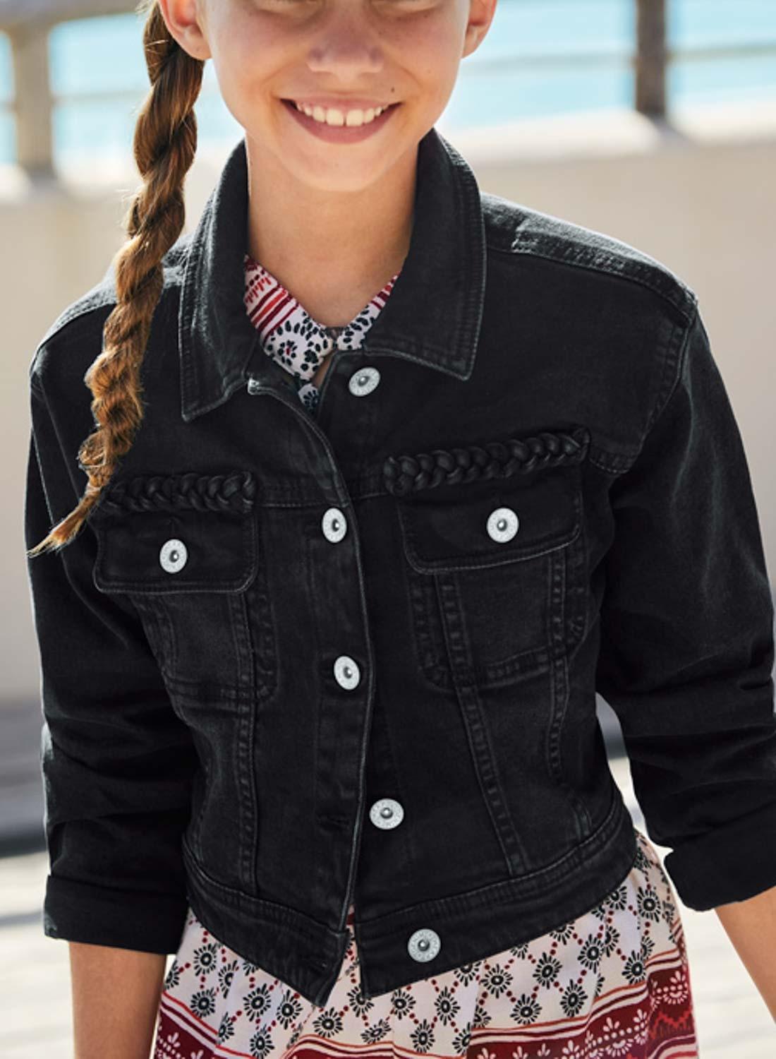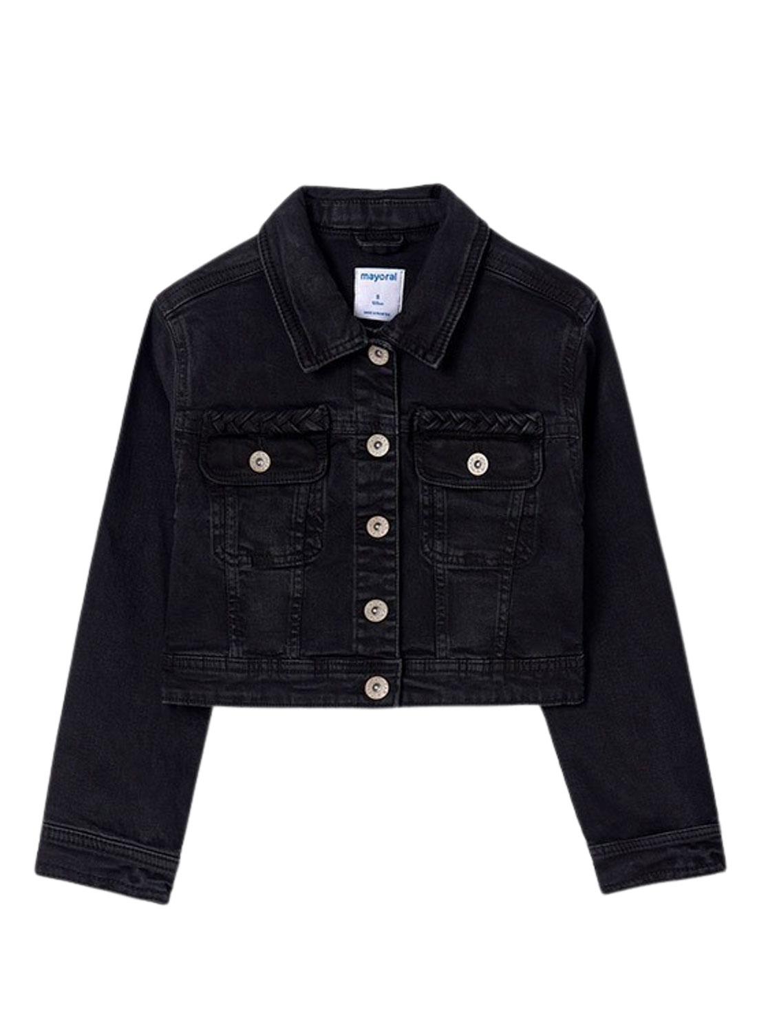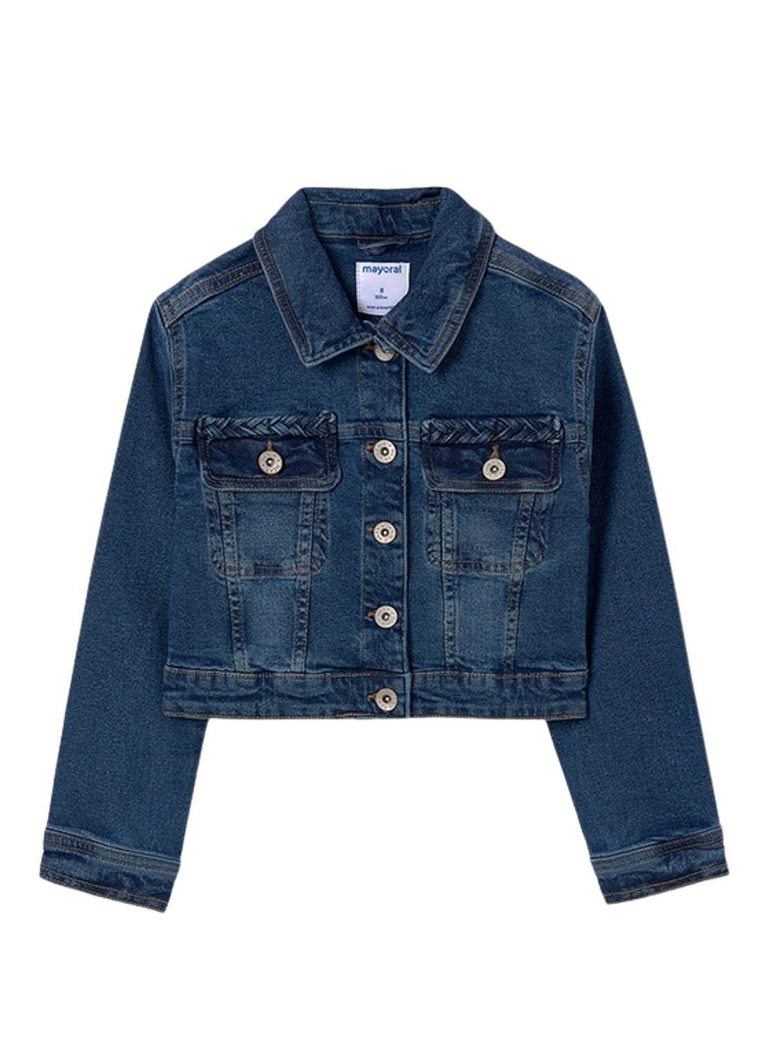 Caçadora de ganga Mayoral em azul médio com detalhes em guipir para menina.