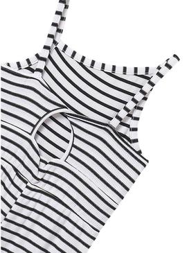 Overall Mayoral. Gola assimétrica. Com alças. Tecido em malha canelada. Abertura traseira. Corte na cintura. Estampa de listras pretas. Perna larga. Formato longo.