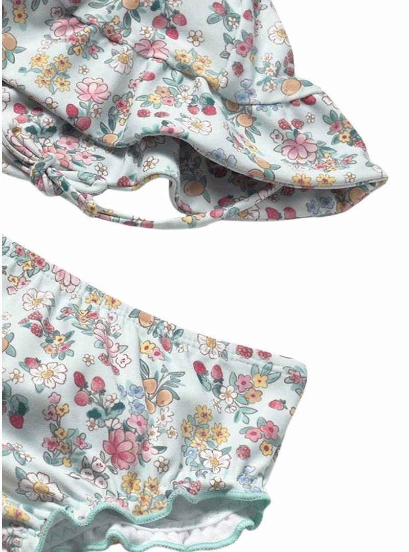 Conjunto Mayoral de 3 peças para banho. Com proteção solar. Camiseta branca. Sem mangas. Detalhes com estampa de flores. Estampa no peito. Cueca com estampa de flores. Touca combinando com babado.