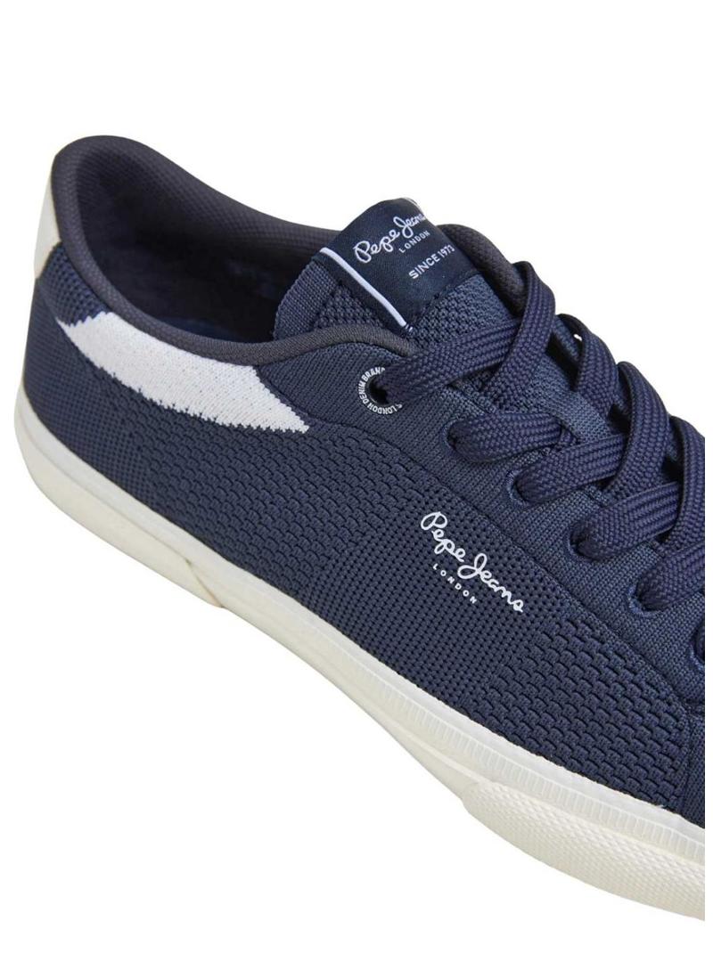 Tênis Pepe Jeans. Modelo Kenton Knit. Cor azul marinho. Malha de tricô. Fecho de cadarço e ilhós metálicos. Logotipo termosselado na lateral. Palmilha termoperfurada e removível. Calcanhar em contraste. Sola de borracha.