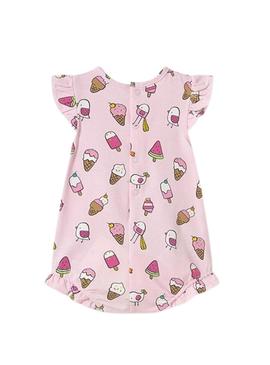 Conjunto de 3 macacões Mayoral. Cor rosa. Diferentes estampas. Fecho traseiro com botões. Gola redonda. Manga com babados. Detalhe de babados nas pernas. Fecho com botões na entreperna.