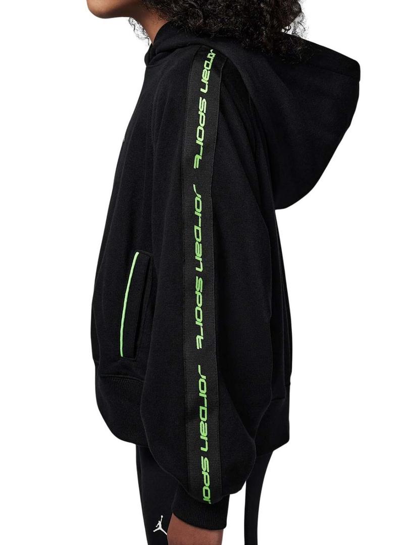 Moletom Jordan. Modelo Dri-FIT Sport. Cor preta. Feito de um tecido macio French Terry. Com capuz. Tecnologia Dri-FIT de secagem rápida e absorção de umidade. Bolsos laterais. Detalhes da marca em verde neon. Acabamentos canelados. Logotipo no peito.