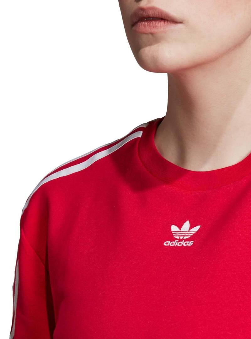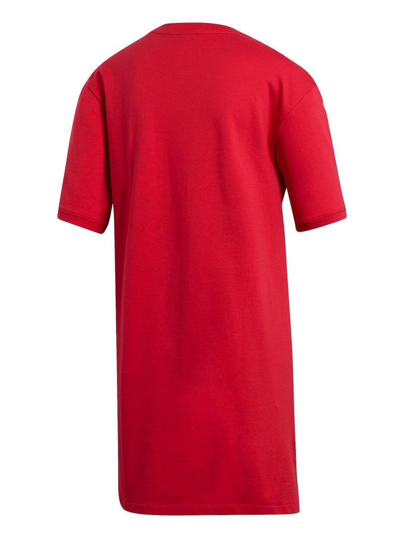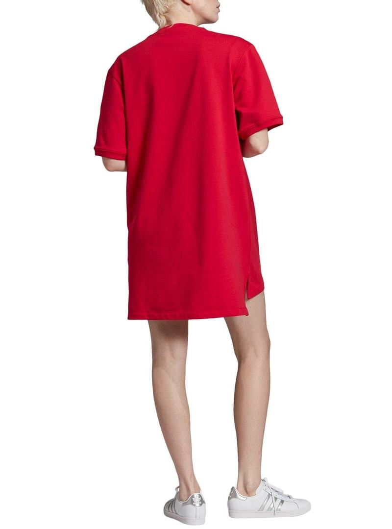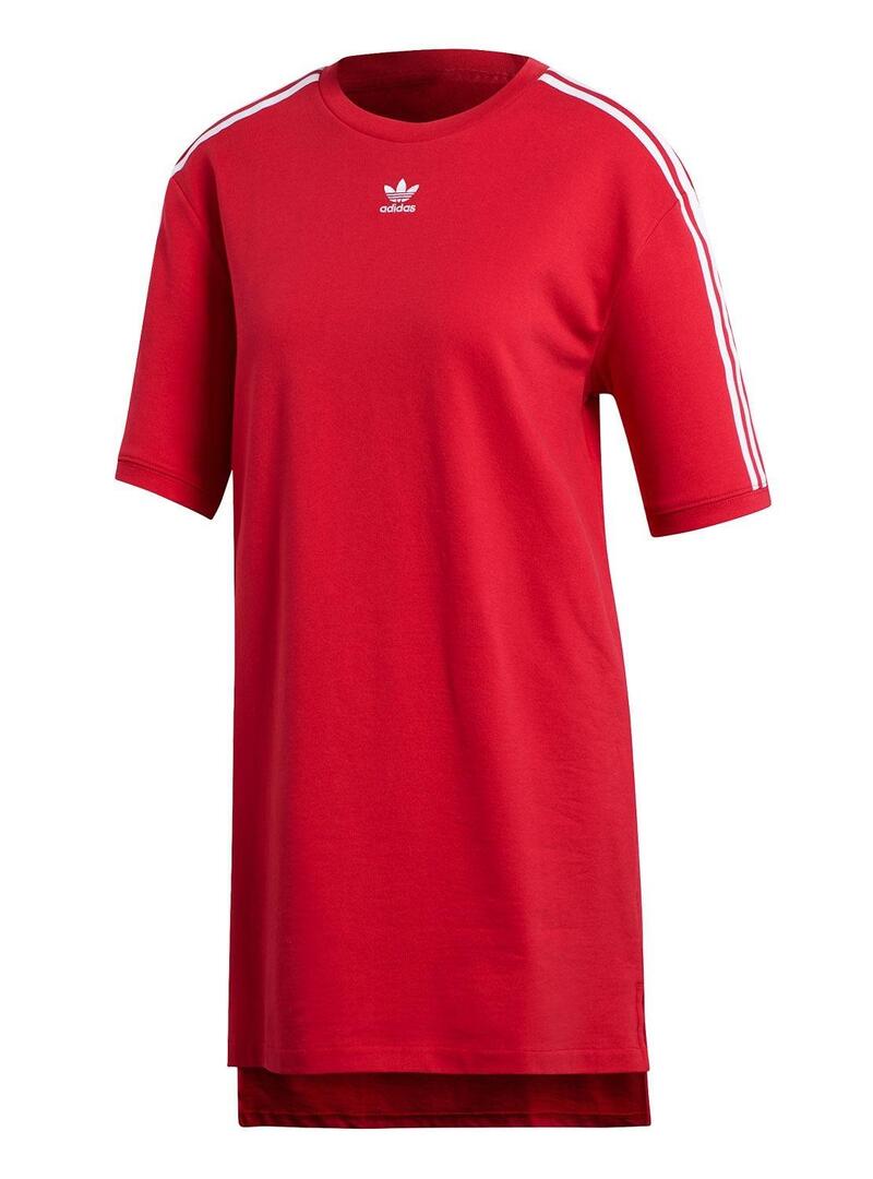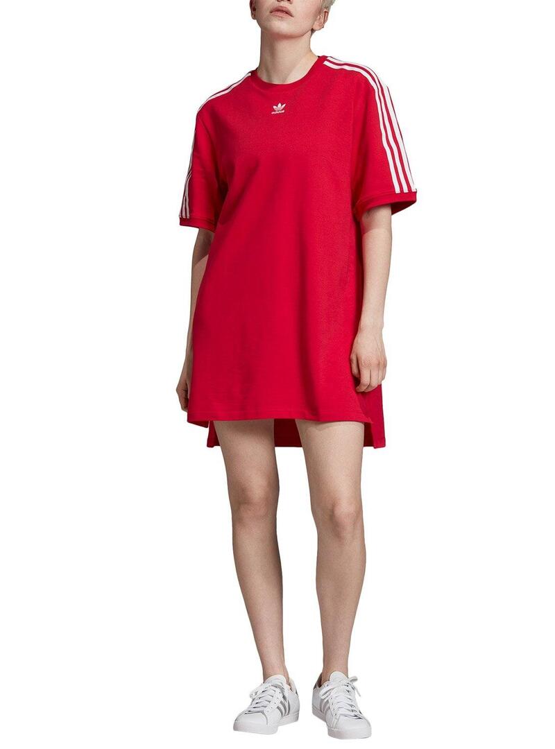 Vestido Adidas. Cor rosa. Tecido macio de pelúcia. Manga curta. 3 bandas em contraste. Mais para trás Costuras laterais abertas. Corte folgado. O modelo é de tamanho 36.