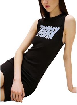 Vestido Tommy Jeans. Modelo Bubble. Cor preta. Sem mangas. Gola redonda. Comprimento mini. Marca estampada no peito em azul claro. Corte ajustado.