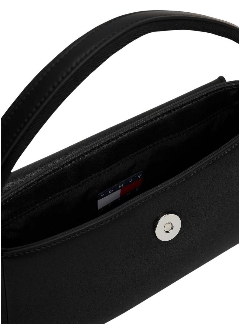 Bolsa Tommy Jeans. Modelo Everywhere Flap. Cor preta. Fecho com aba. Botão de pressão. Logotipo metálico em prata. Alça superior. Alça de ombro ajustável e removível. Dimensões: 22,5 × 5,5 × 13 cm.