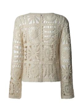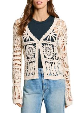 Jaqueta Pepe Jeans. Modelo Olympia. Cor branco quebrado. Fecho com botões. Decote em V. Manga comprida. Ajuste regular. Tecido vazado com detalhes geométricos. Ajuste regular.