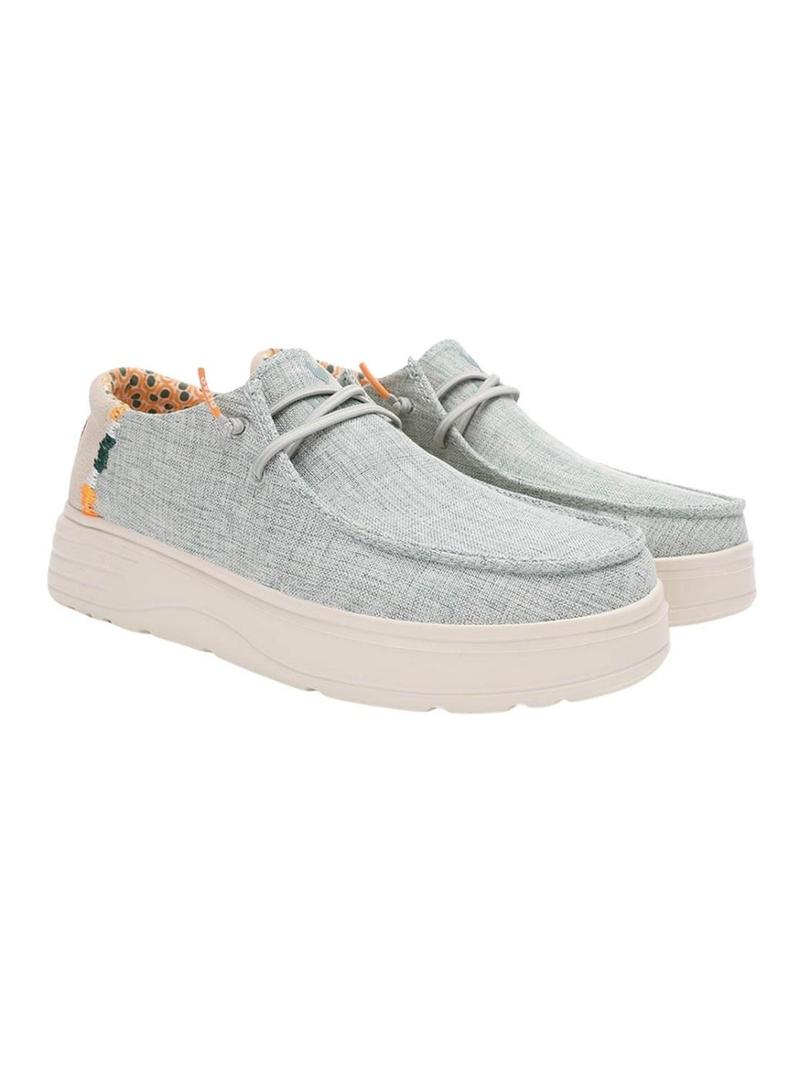 Tênis Walkin Pitas. Modelo Poppy. Cor verde. Parte superior em têxtil mesclado. Detalhes étnicos bordados. Cadarços elásticos. Palmilha de EVA e couro removível. Forro têxtil com elastano. Sola de EVA ultraleve com 4,5cm de altura. Parte traseira em camurça bege.