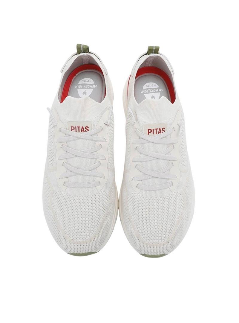 Tênis Walkin Pitas. Modelo Cue. Cor branca. Parte superior têxtil feita com poliéster reciclado de garrafas PET. Palmilha de espuma com memória de pisada. Sola de EVA muito leve. Cadarços elásticos. Parte superior em malha respirável. Gola elástica.