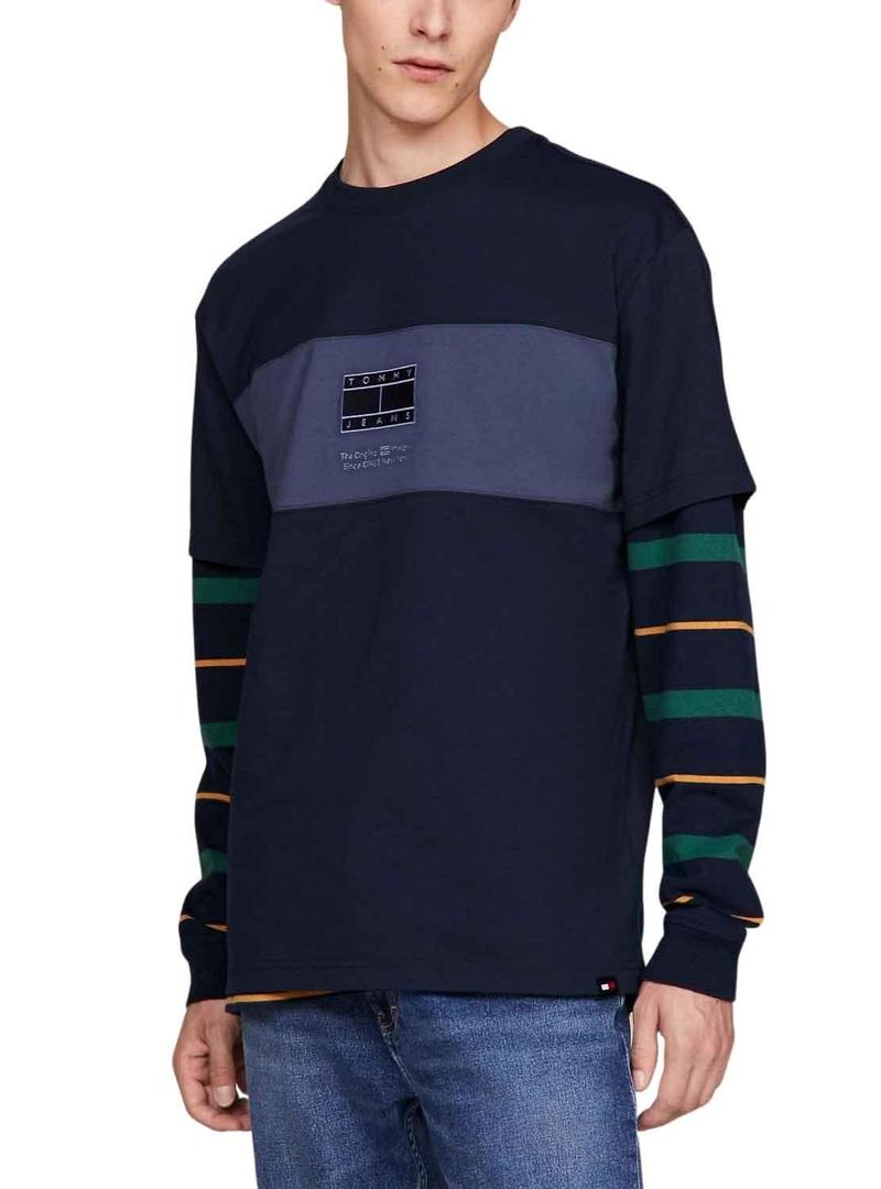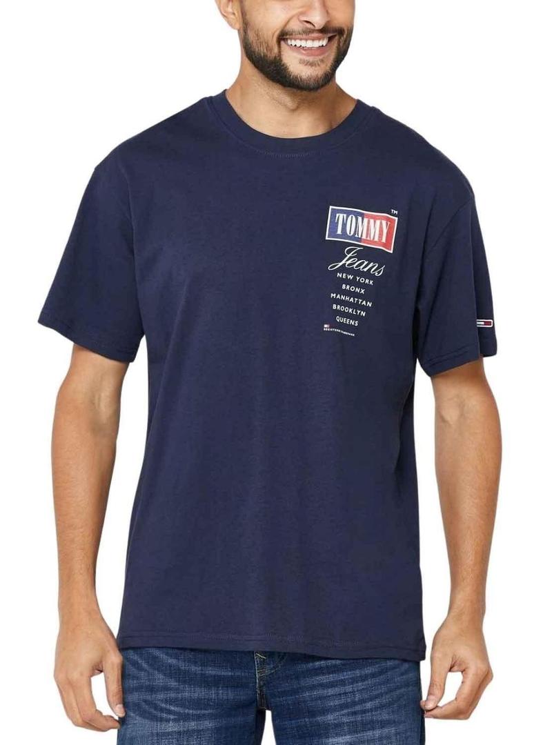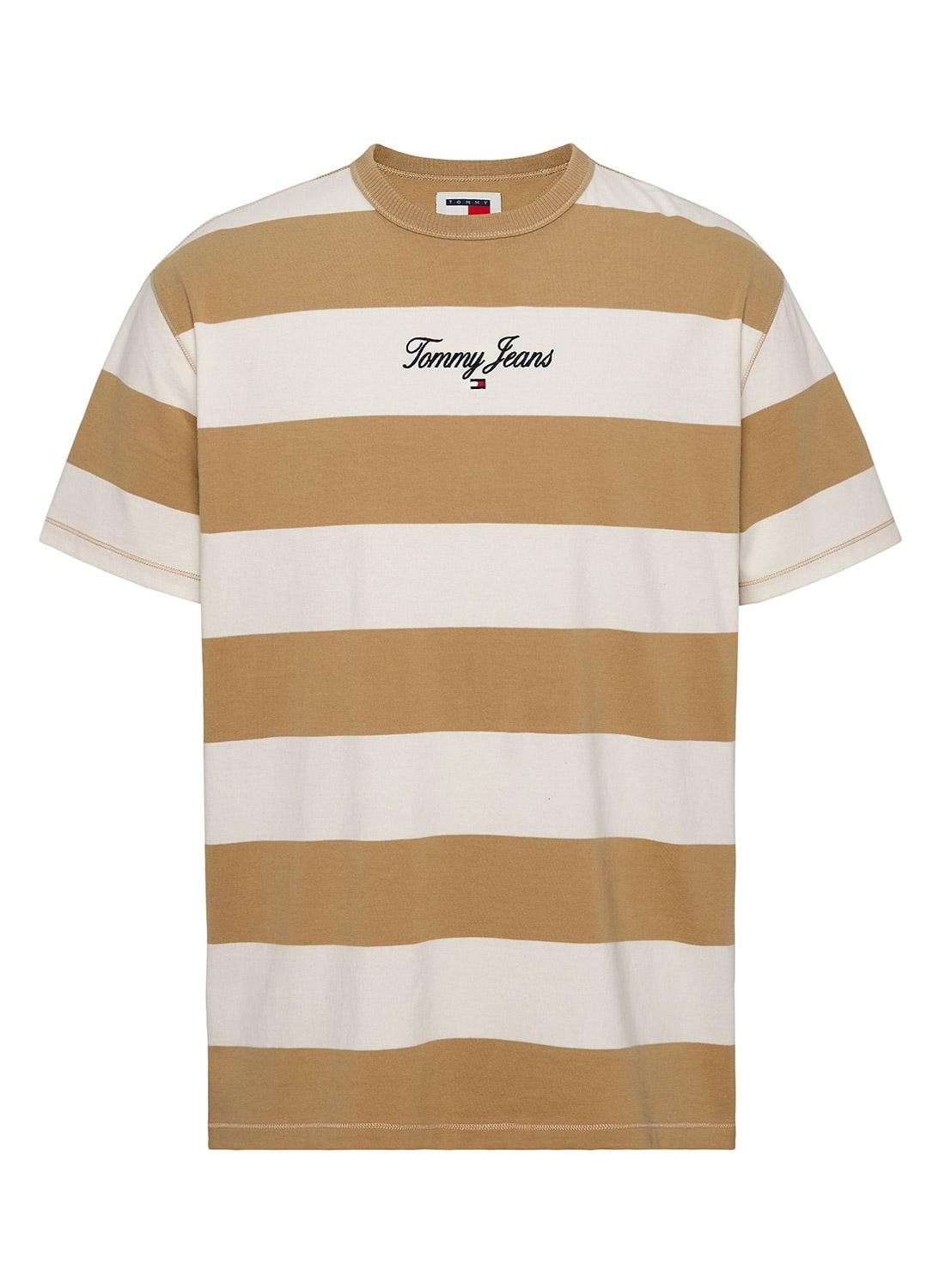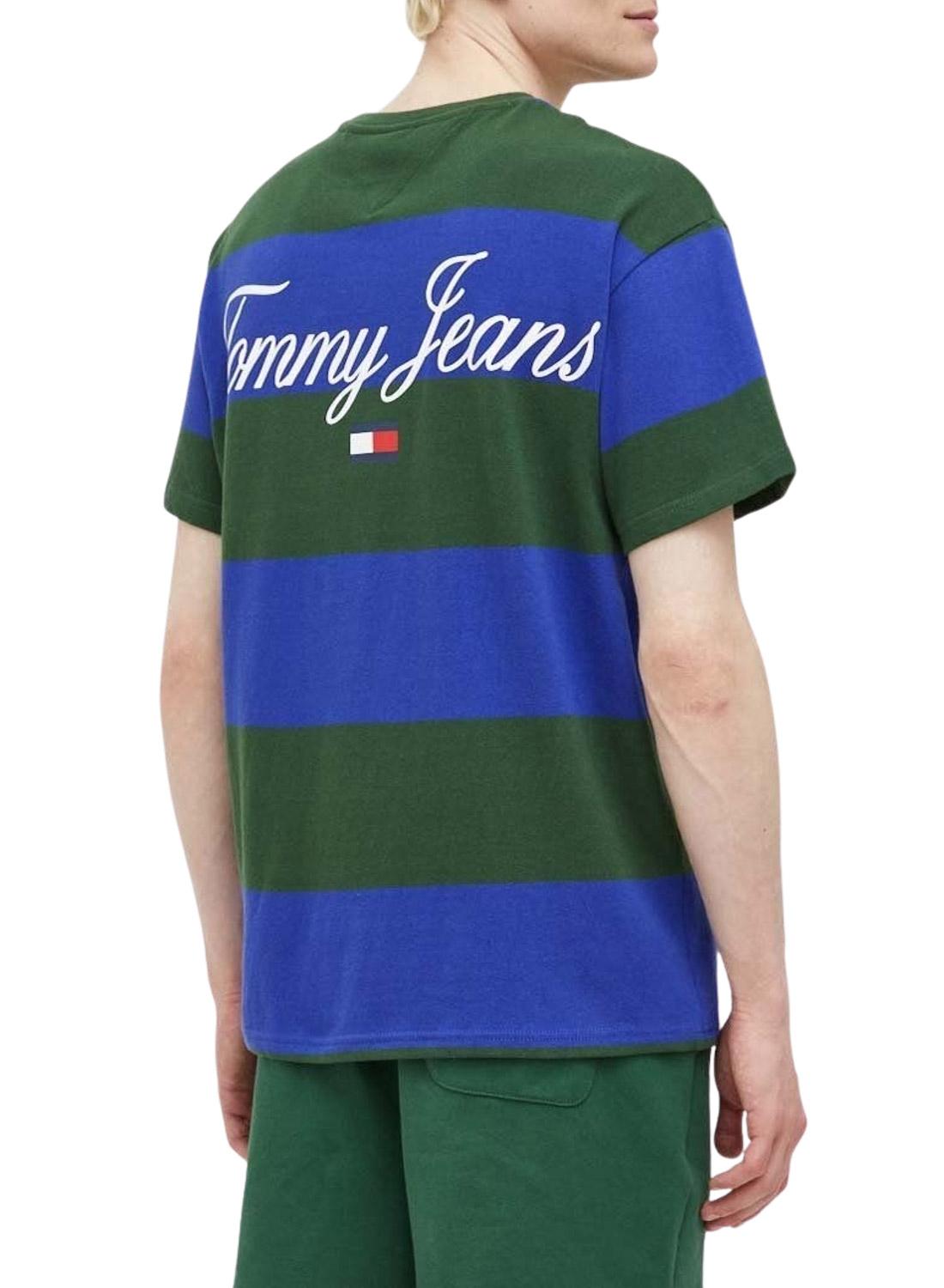 Camiseta Tommy Jeans Stripe azul e branco para homem.