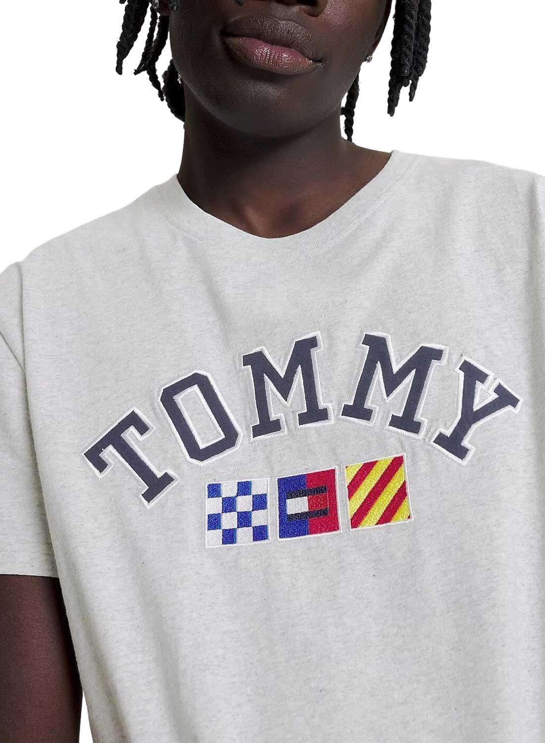 Camiseta Tommy Jeans. Modelo Stripe. Cor branca e azul marinho. Gola redonda com detalhe em vermelho. Manga curta. Estilo marinheiro. Patch da marca bordado no peito. Ajuste regular.