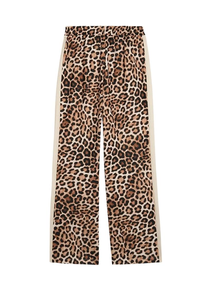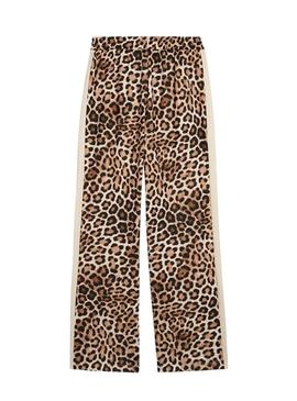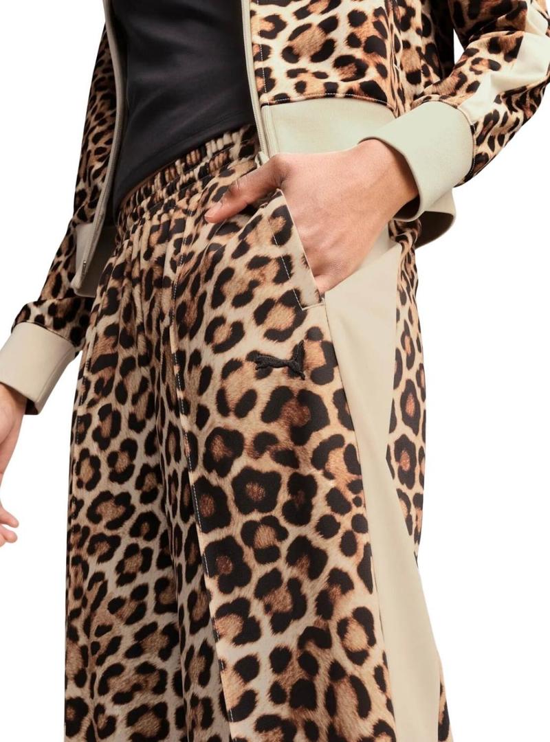 Calça de moletom Puma. Modelo Leo Luxe. Cor marrom. Estampa de leopardo. Tecido leve. Cintura elástica. Corte reto. Costura central. Faixa lateral em cor bege. Estilo esportivo. Bolsos laterais. Logo bordado.