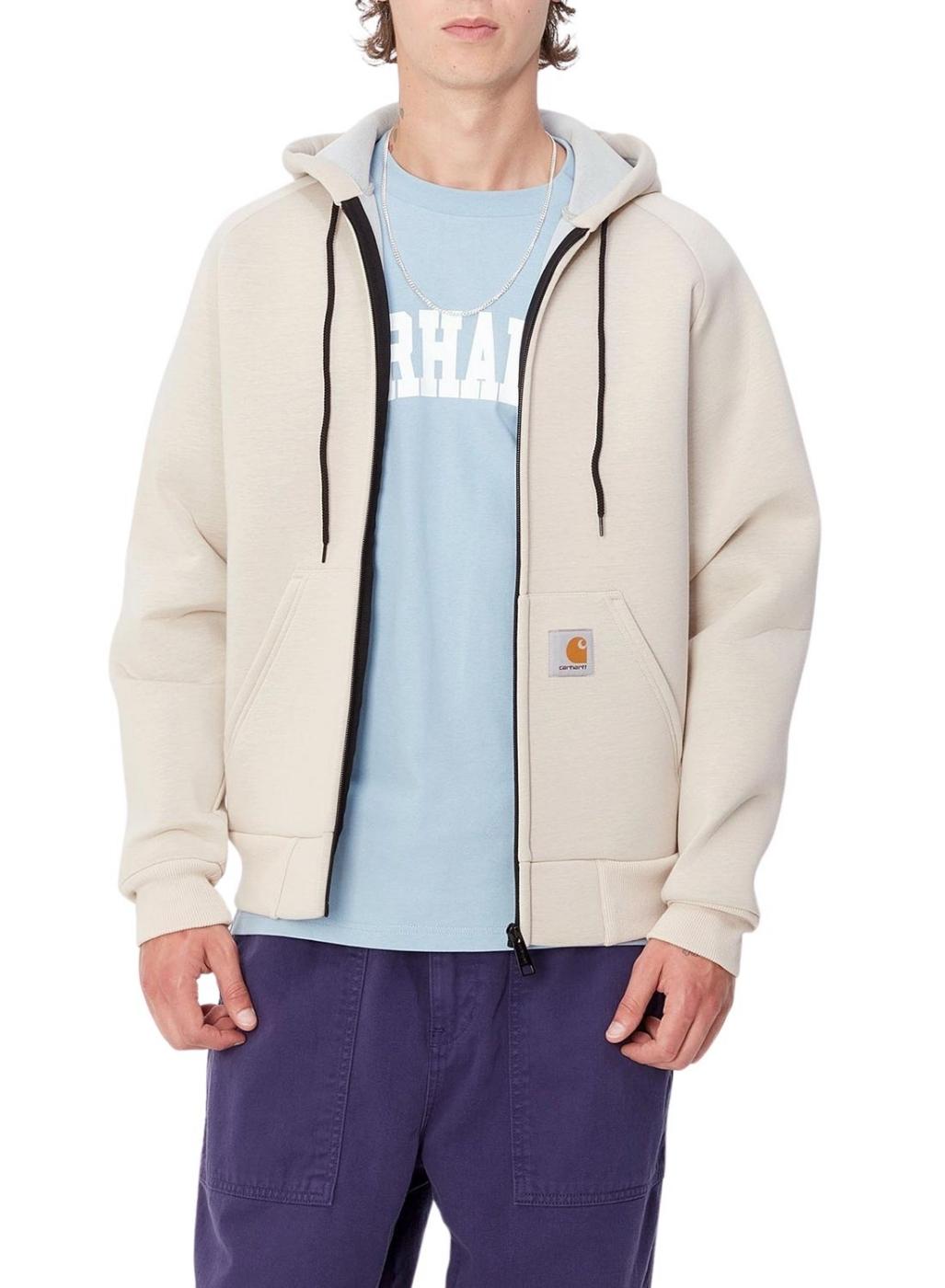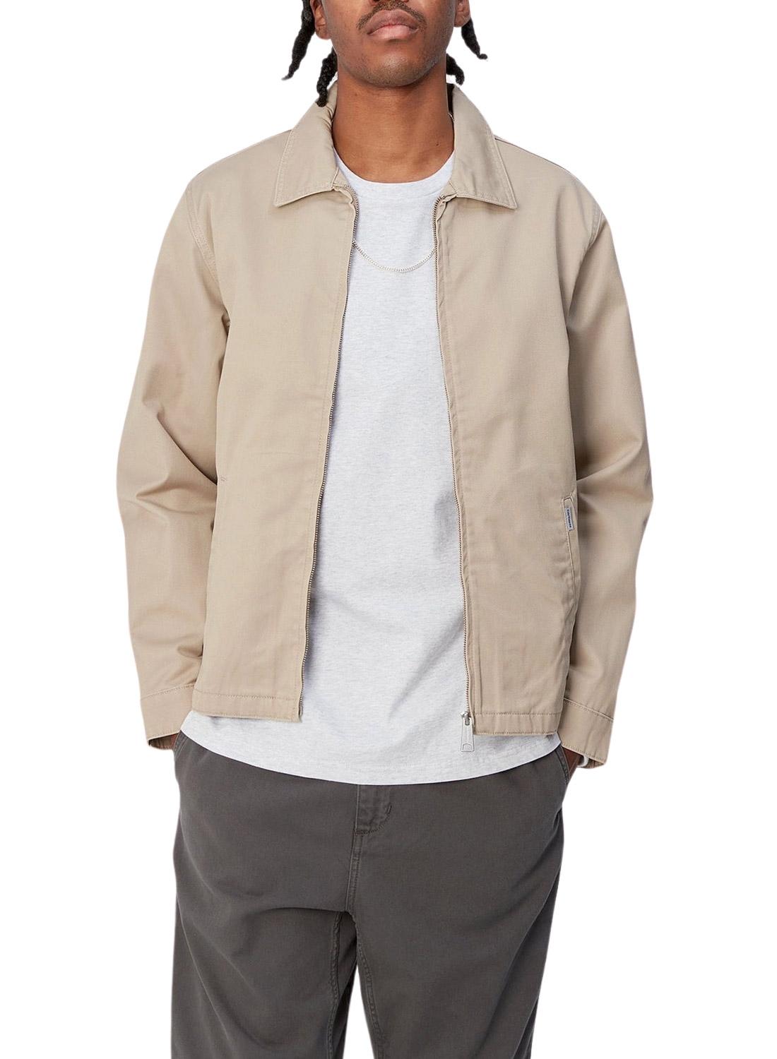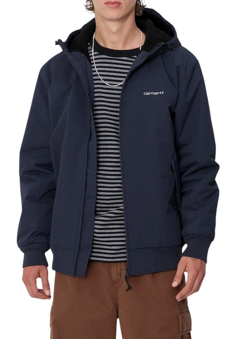 Retorna-me apenas a tradução para o português disso: Casaco Carhartt. Modelo Racer. Cor preta. Fecho com zíper. Gola camiseira. Bolsos laterais. Corte reto. Logotipo bordado no peito em estilo vintage. Ilustração estampada nas costas em cor cinza.